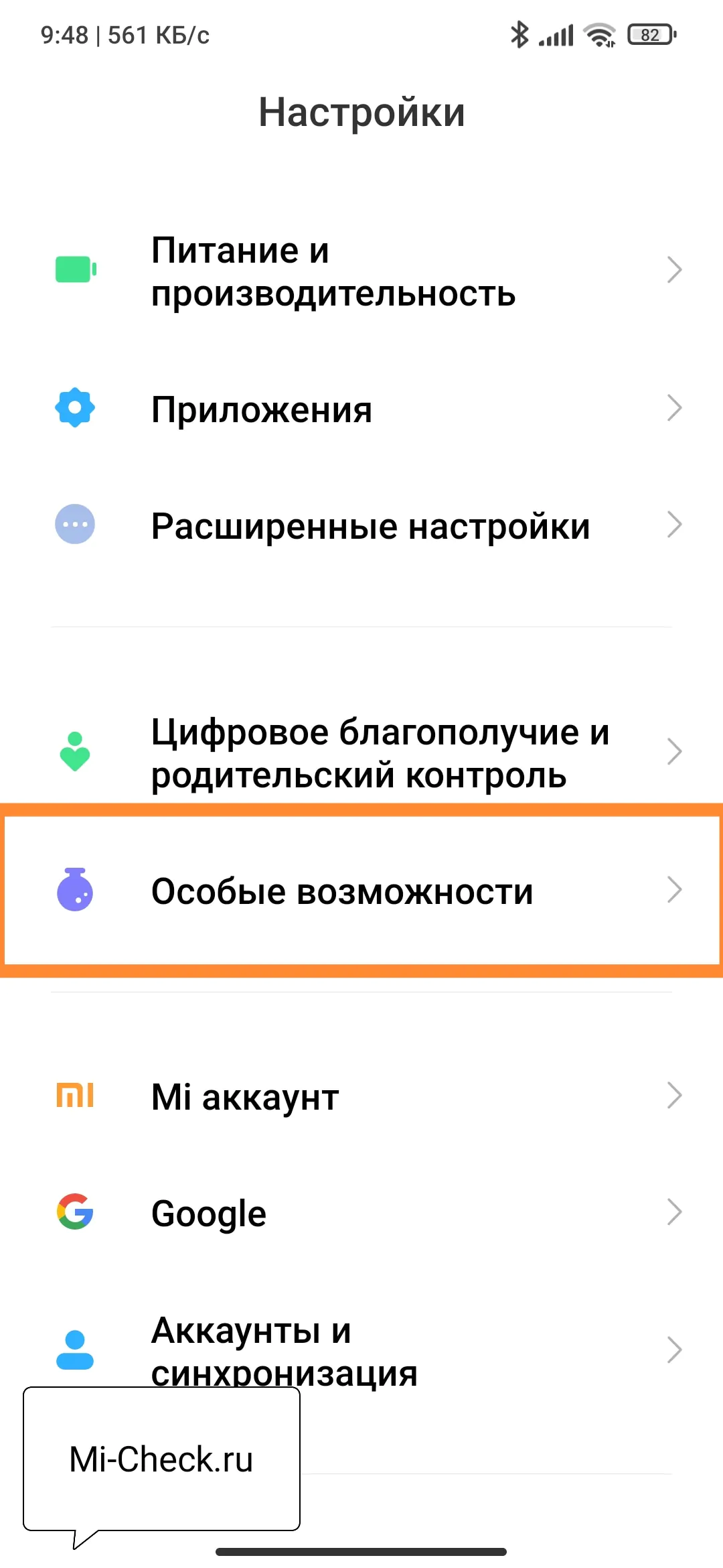 - Чтобы включить её откройте «Общие настройки» Xiaomi, найдите строку «Особые возможности».