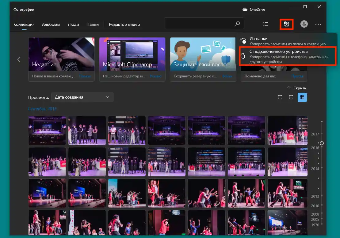 Вверху окна справа нажмите кнопку Импорт, а в выпавшем меню “C подключенного устройства”