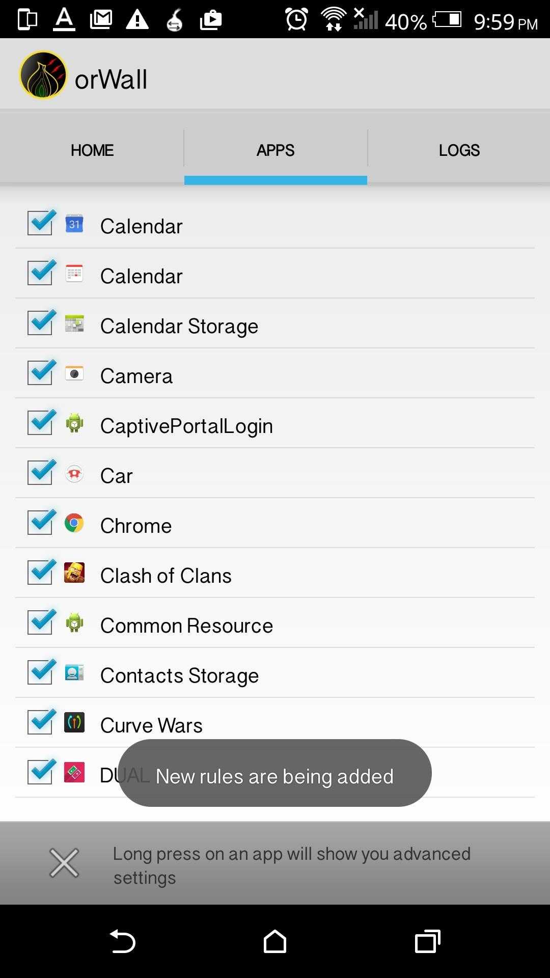 Рисунок 2. Раздел «Apps» в настройках приложения OrWall