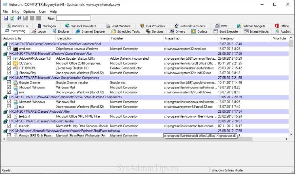 Здесь как раз можно и посмотреть, что включено, а что нет. Правым кликом – отключить ненужное приложение. Также отлично справляется с выявлением “паразитов” в автозагрузке бесплатная утилита от Марка Руссиновича Autoruns for Windows, но она больше подходит для более продвинутых пользователей, и неподготовленный человек может в ней наломать немало дров.