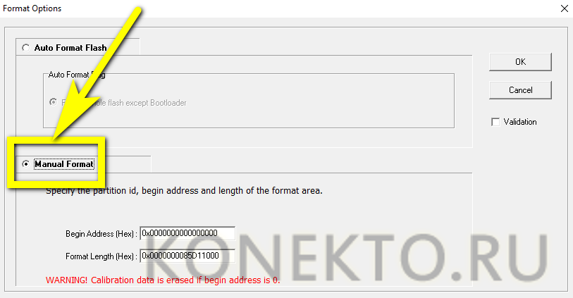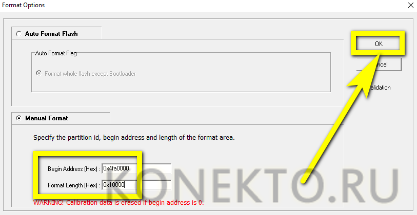 И ввести в верхнем и нижнем текстовых полях те же значения: 0x4fa0000 и 0x10000 соответственно. Нажать «ОК».
