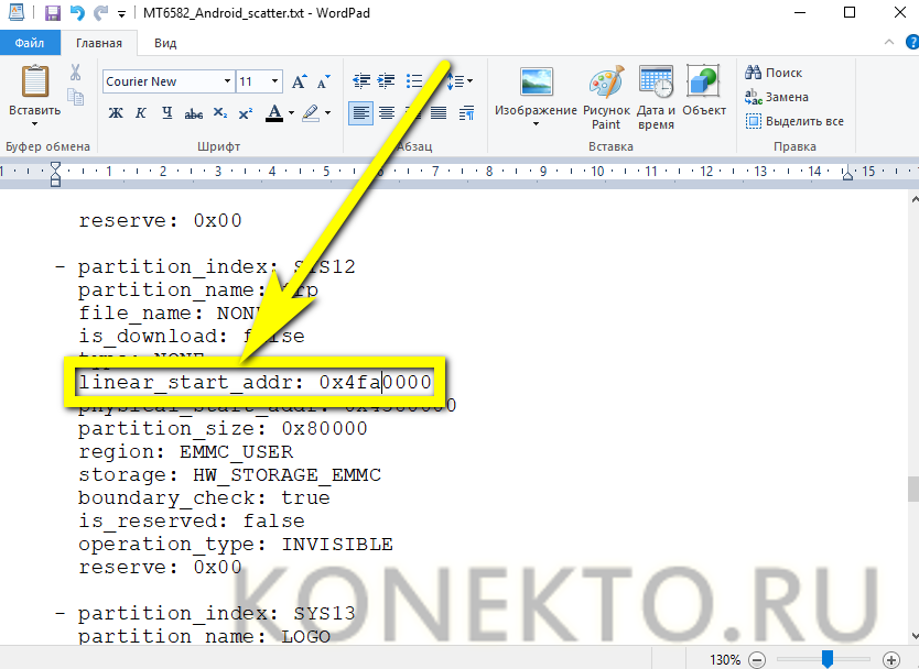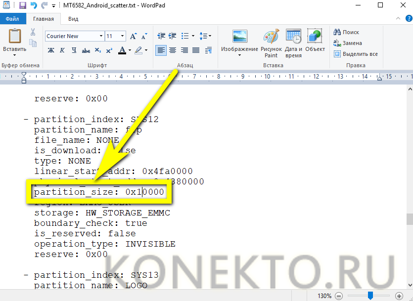 А для строки partition_size — 0x10000. Закрыть файл, подтвердив внесённые коррективы.