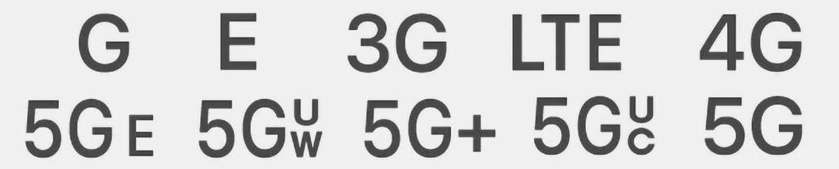 Возможны варианты для таких видов соединений: GPRS (G), EDGE (E), 3G, LTE, UMTS (4G), 5G E, 5G UW, 5G+, 5G UC, 5G.