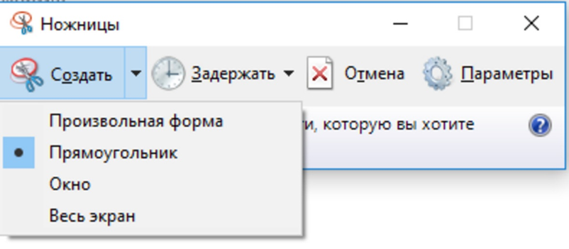 - Выберите один из режимов захвата экрана, нажав на соответствующую кнопку. Вы можете сделать снимок произвольной формы, прямоугольника, а также снять окно или весь экран.