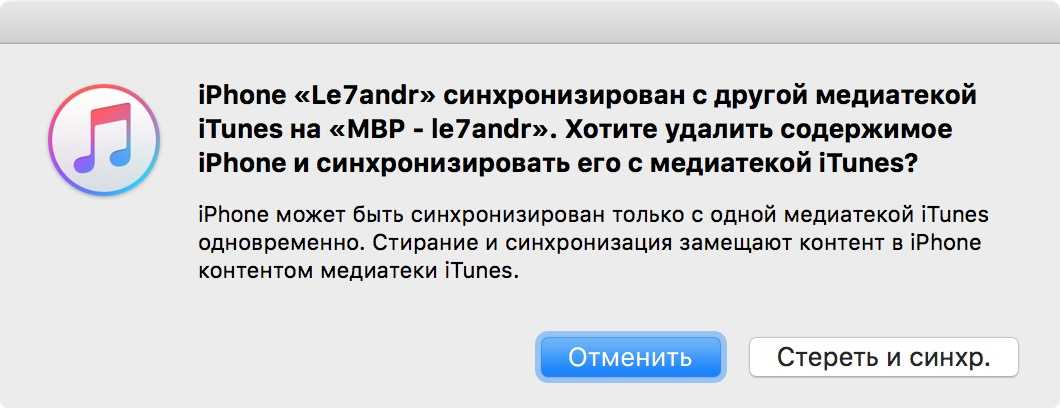 «iPhone синхронизирован с другой медиатекой iTunes. Хотите удалить содержимое iPhone и синхронизировать его с медиатекой iTunes?».