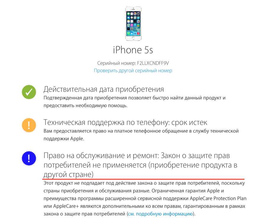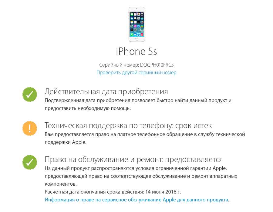 Узнать свои права на гарантию можно на сайте Apple , указав в соответствующем поле серийный номер вашего девайса («Настройки»/»Основные»/»Об этом устройстве»/»Серийный номер»). Смотрите, первый iPhone 5S ввезен в Россию легально и может легко получить здесь бесплатный ремонт и обслуживание.