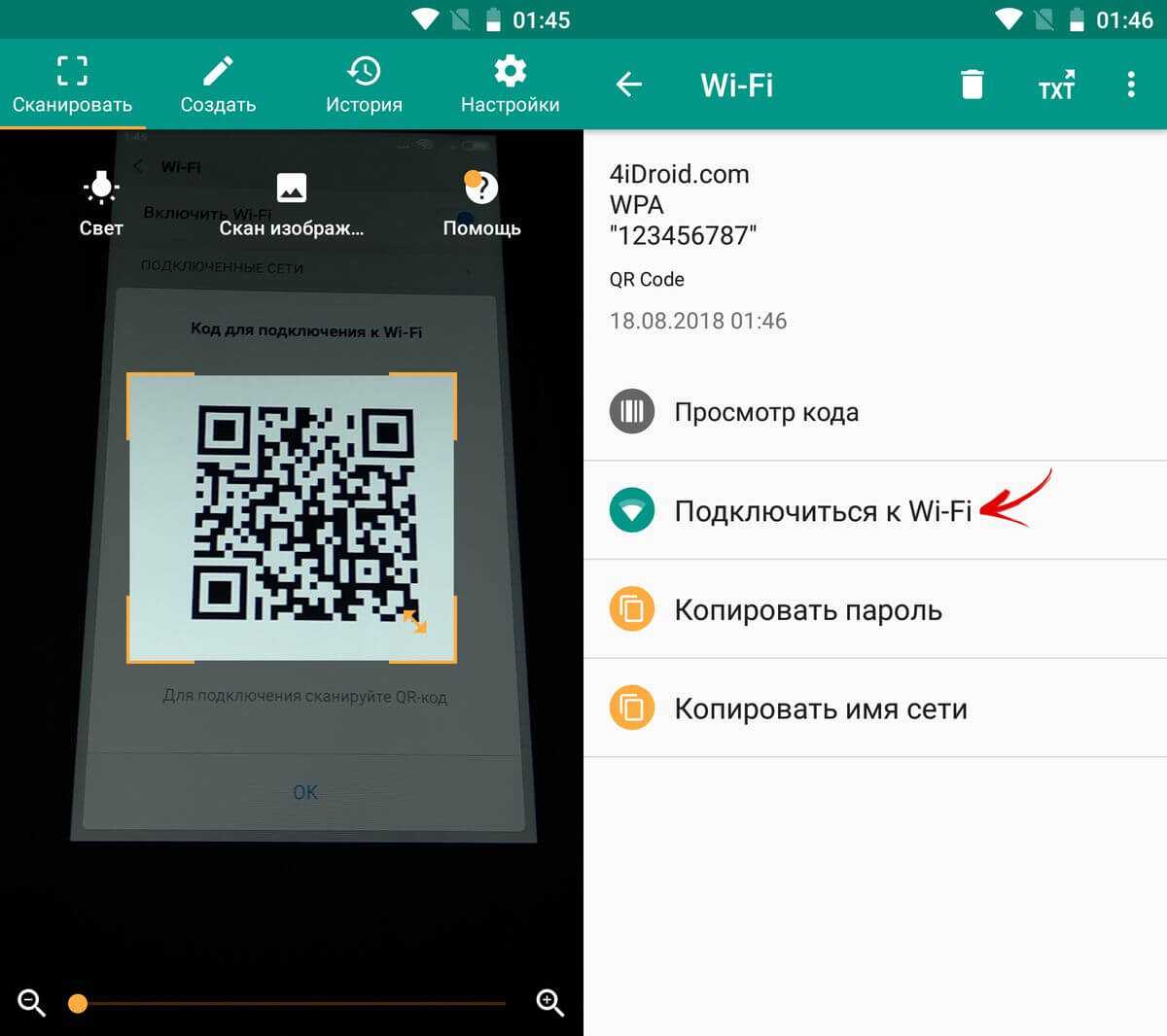 Его нужно отсканировать на другом телефоне и согласиться на подключение к беспроводной сети.