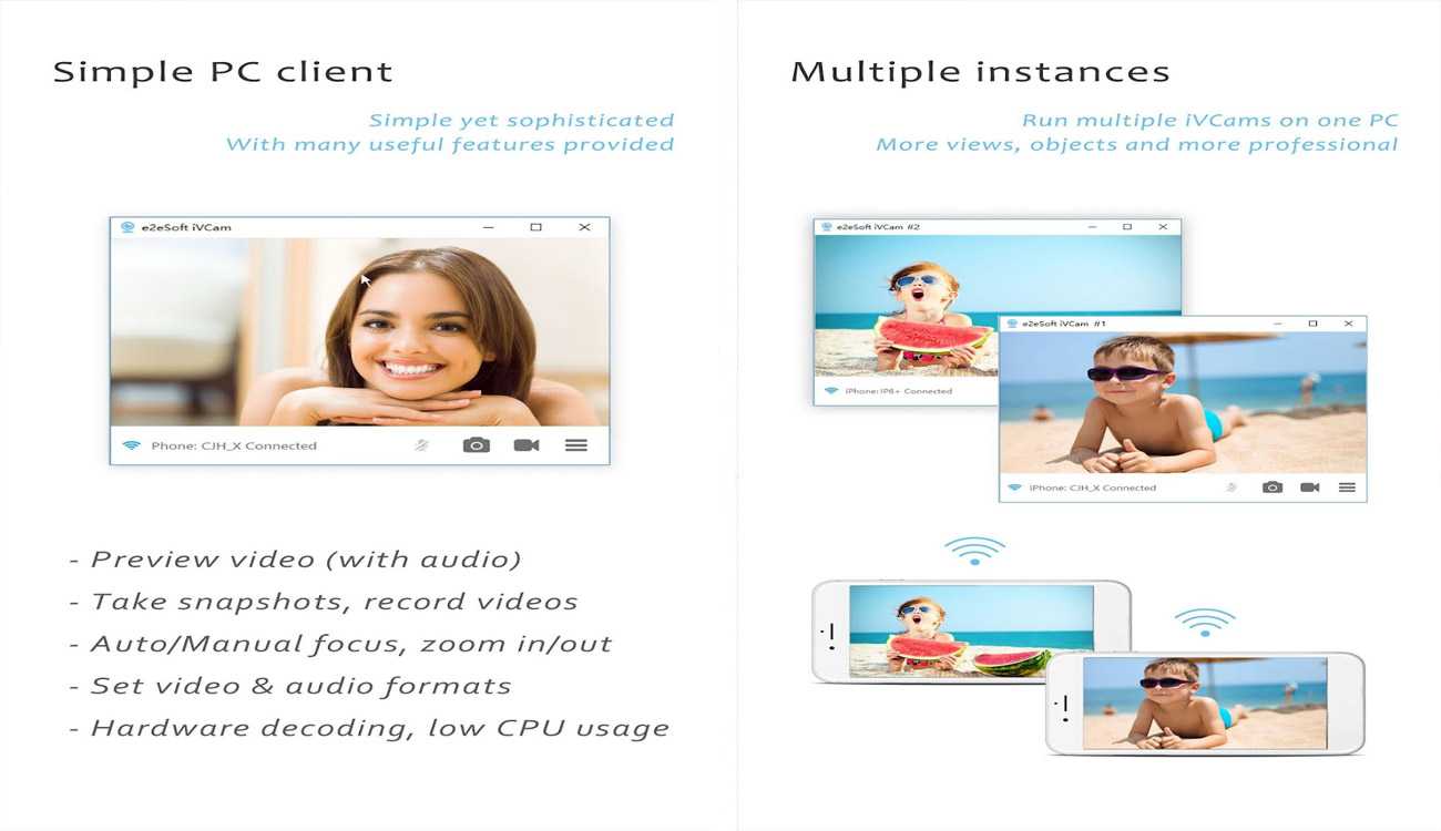iVCam превращает ваш смартфон / планшет в HD веб-камеру для Windows PC. Вы также можете заменить свою старую USB веб-камеру или встроенную веб-камеру на нее, которая имеет лучшее качество.