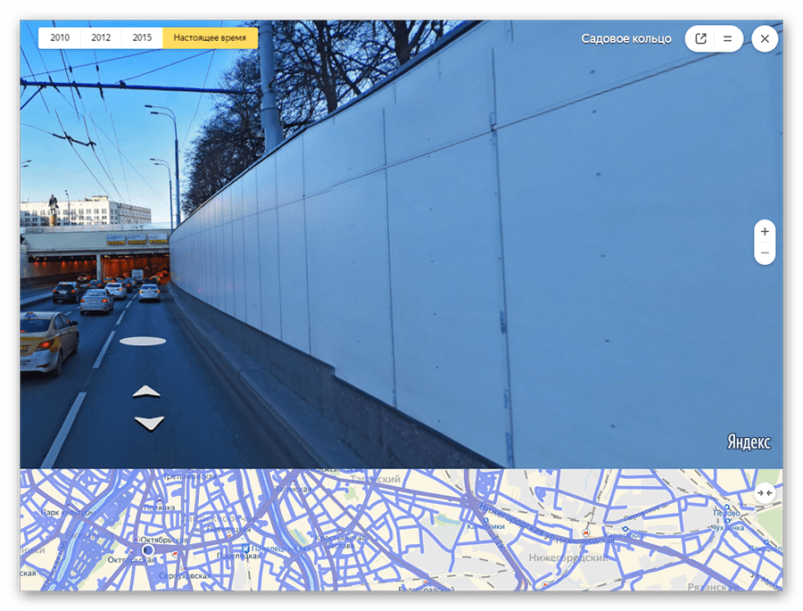 - Нажмите на то место, где хотите оказаться, и вместо карты появится панорама. Для передвижения по дорогам перемещайте курсором белый круг и кликайте левой кнопкой мыши, чтобы переместиться, либо нажимайте на стрелки внизу фотографии. Сверху, если это необходимо, вы можете выбрать год съемки. Для выхода из панорамы в правом верхнем углу присутствует кнопка в виде крестика.