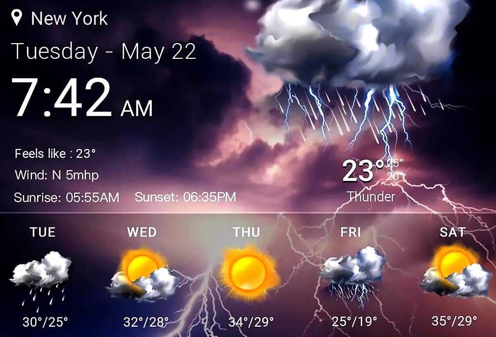 Особенность приложения — яркое и красивое оформление с завораживающей анимацией. Сообщает информацию о погоде на настоящий день или на неделю и определяет: