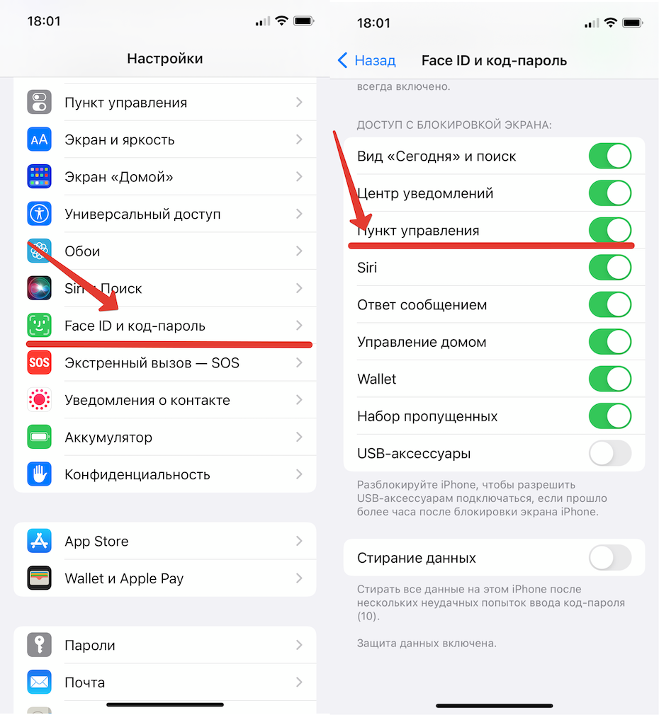 Для начала нужно настроить права доступа приложениям к заблокированному экрану. Пройдите по пути «Настройки» —> «Face ID и код-пароль». В разделе «Доступ с блокировкой экрана» активируем «Пункт» управления».
