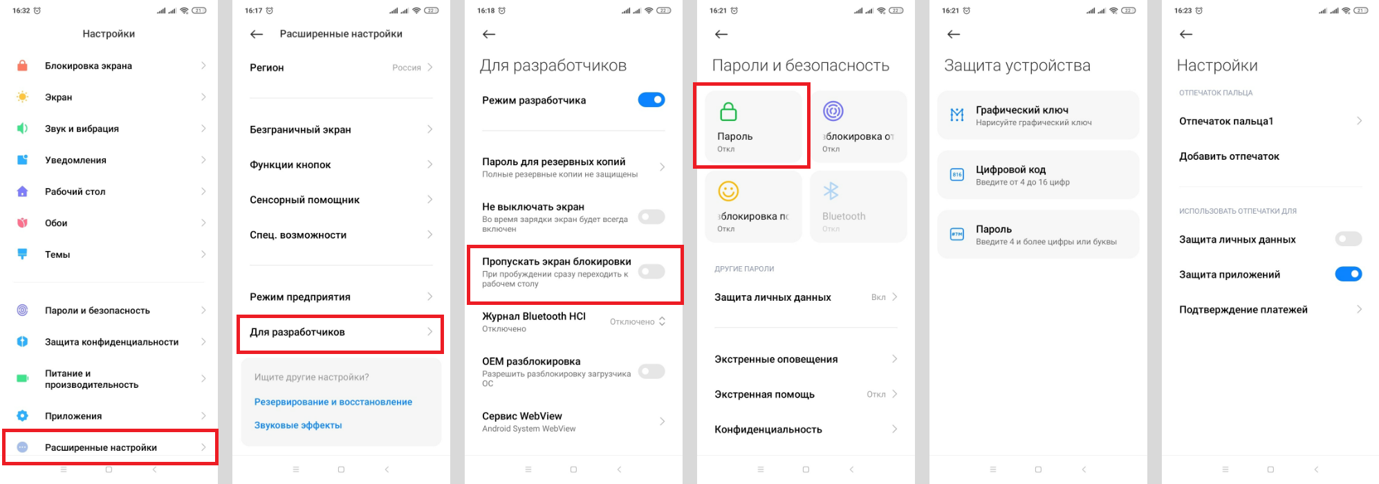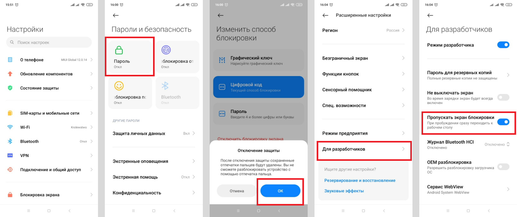 2. Шаг 2 — вернуться в предыдущее меню. Выбрать «Расширенные настройки» — «Для разработчиков» — отключить бегунок около фразы «Пропускать экран блокировки».