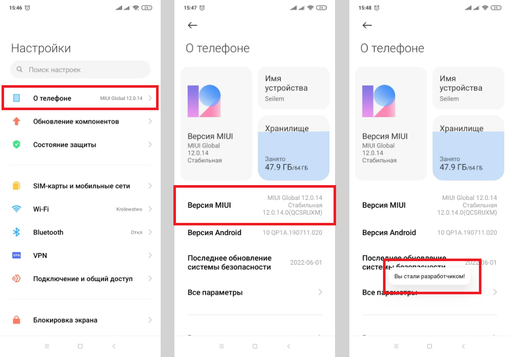 1. Шаг 1 — включить режим разработчика. Нужно зайти в «Настройки» — «О телефоне». 7 раз нажать на надпись «Версия MIUI» и дождаться надписи «Вы стали разработчиком» в нижней части экрана.