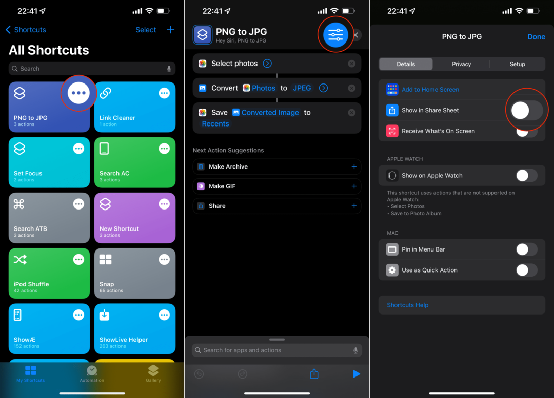 С возможностью отображения ярлыка для преобразования PNG в JPG на iPhone на листе общего доступа, вот и все! Теперь вы можете запускать ярлык всякий раз, когда сохраняете изображение в формате PNG или делаете снимок экрана.