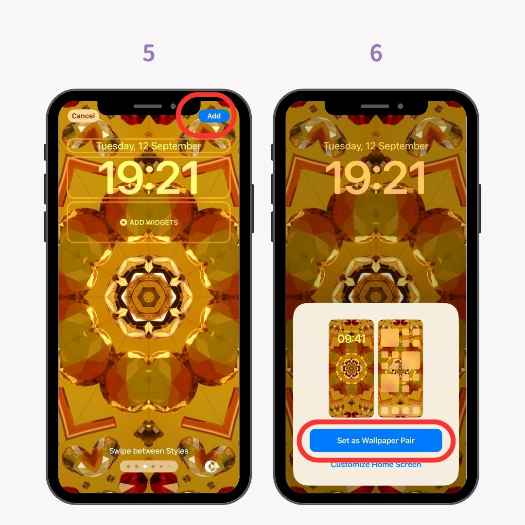 - Коснитесь «Добавить», затем выберите, следует ли использовать обои как для экрана блокировки, так и для главного экрана (в этом случае коснитесь «Установить как пару обоев») или для дальнейшего изменения главного экрана.