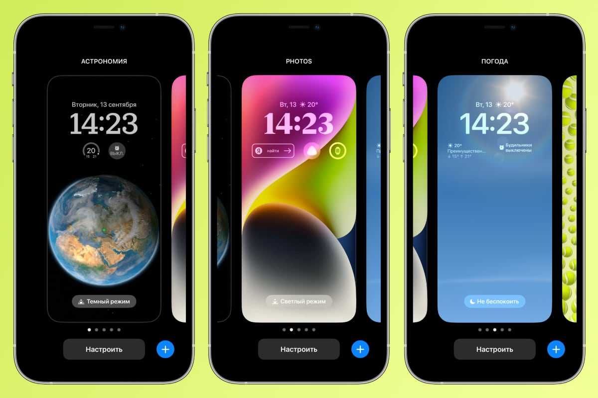 Для светлого режима я создал экран с обоями из iPhone 14, на темную тему поставил заставку с планетой (анимация решает), а для Не беспокоить выбрал отображение погоды на весь дисплей.