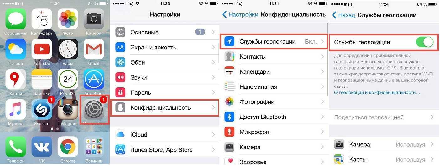 - Включите GPS на iPhone, если это еще не сделано, через панель быстрых настроек или зайдя в Настройки > Конфиденциальность > Службы геолокации.