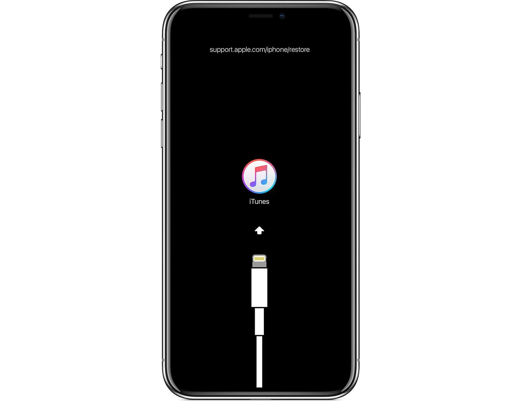 iPhone 8 / X / XS / 11 или более поздней версии: быстро нажмите один раз клавиши громкости вверх и вниз на устройстве, затем удерживайте нажатой клавишу выключения и не отпускайте ее. После черного экрана быстро удерживайте нажатой клавишу уменьшения громкости и не отпускайте ее, пока на экране устройства не отобразится кабель для передачи данных и логотип iTunes.