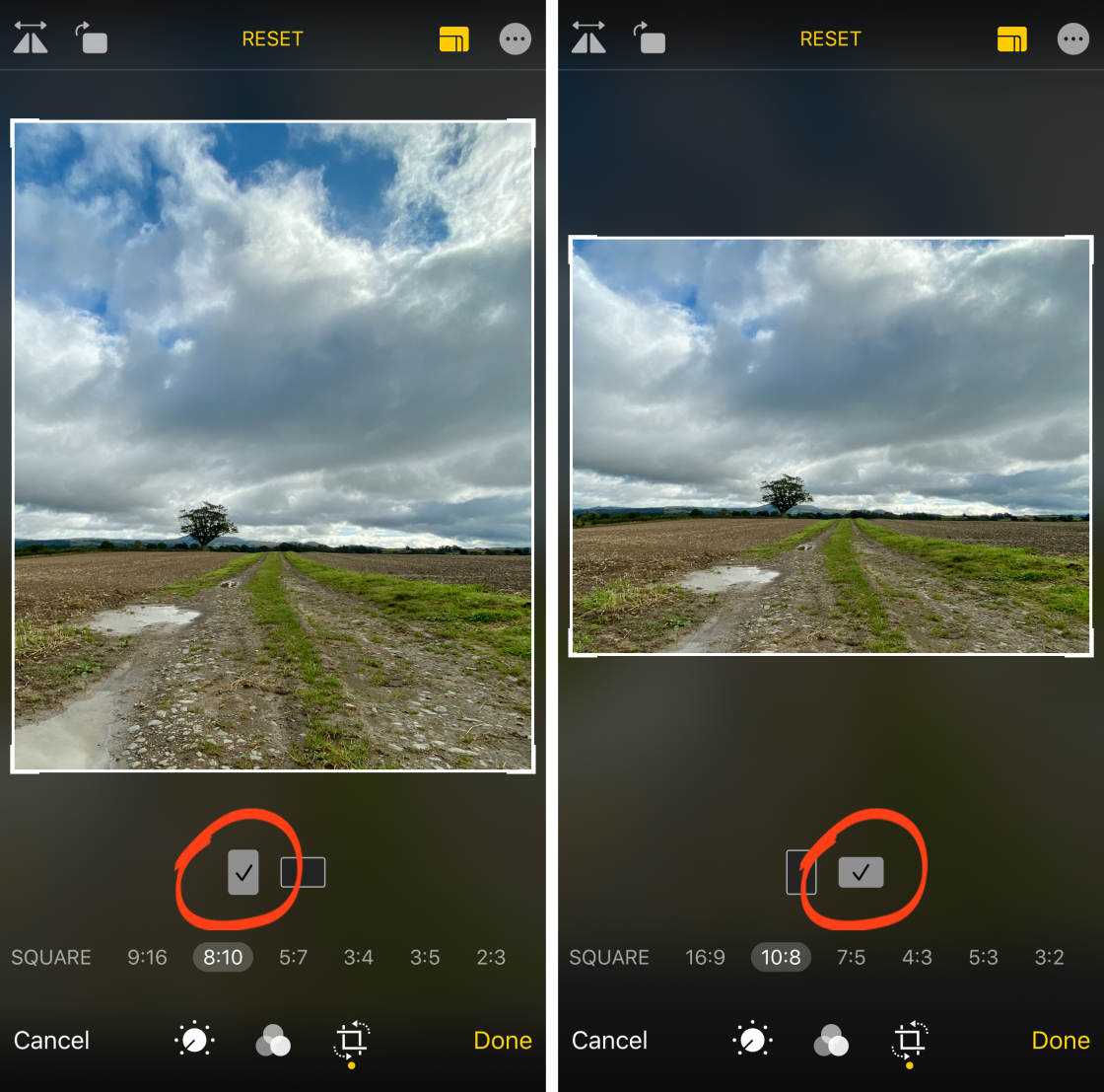 Под опциями соотношения сторон можно выбрать, как обрезать фотографию — вертикально или горизонтально.