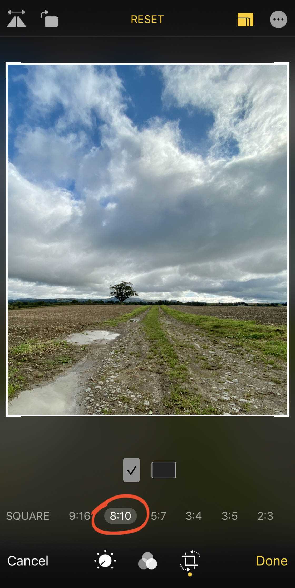 Проведите пальцем по ряду соотношений сторон, например, Квадрат, 9:16, 8:10 и т.д. Затем выберите то, которое вы хотите использовать.