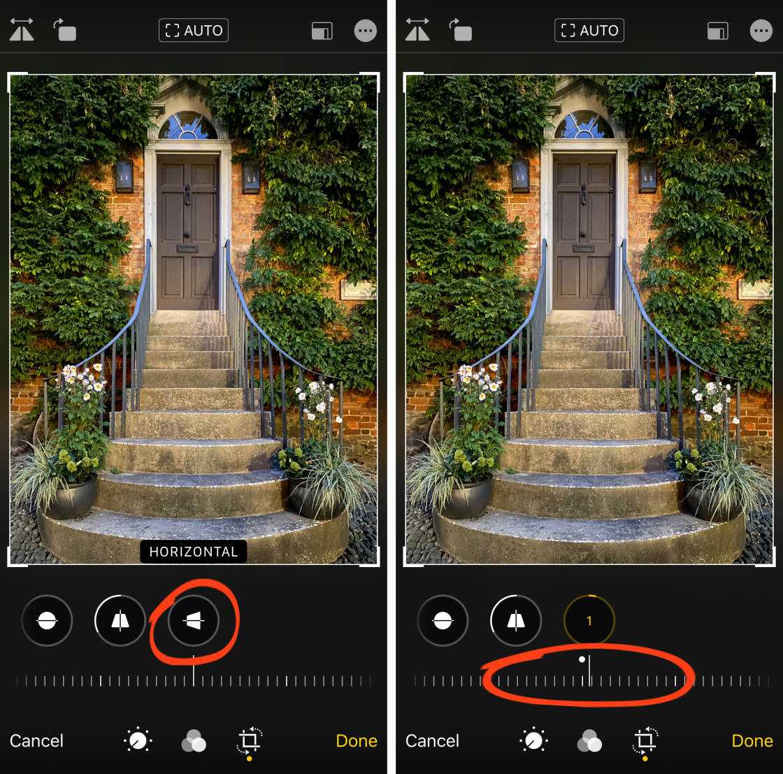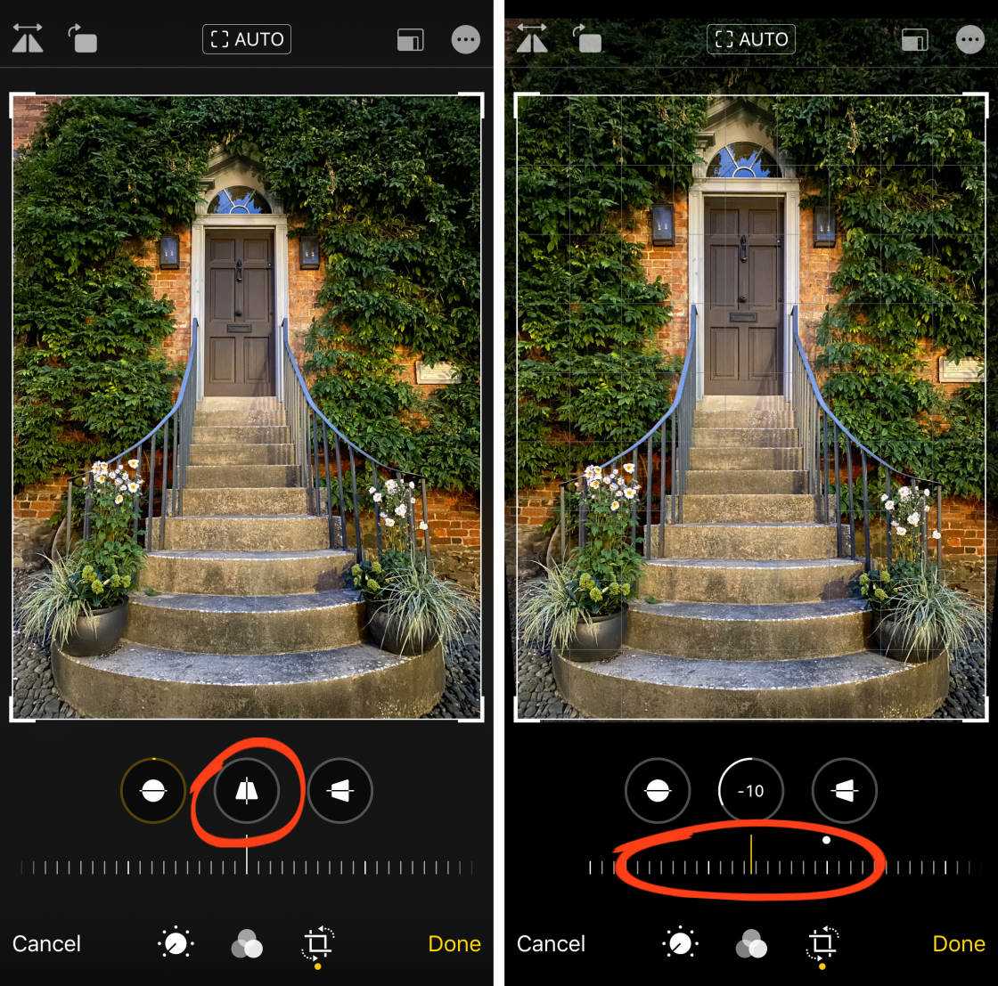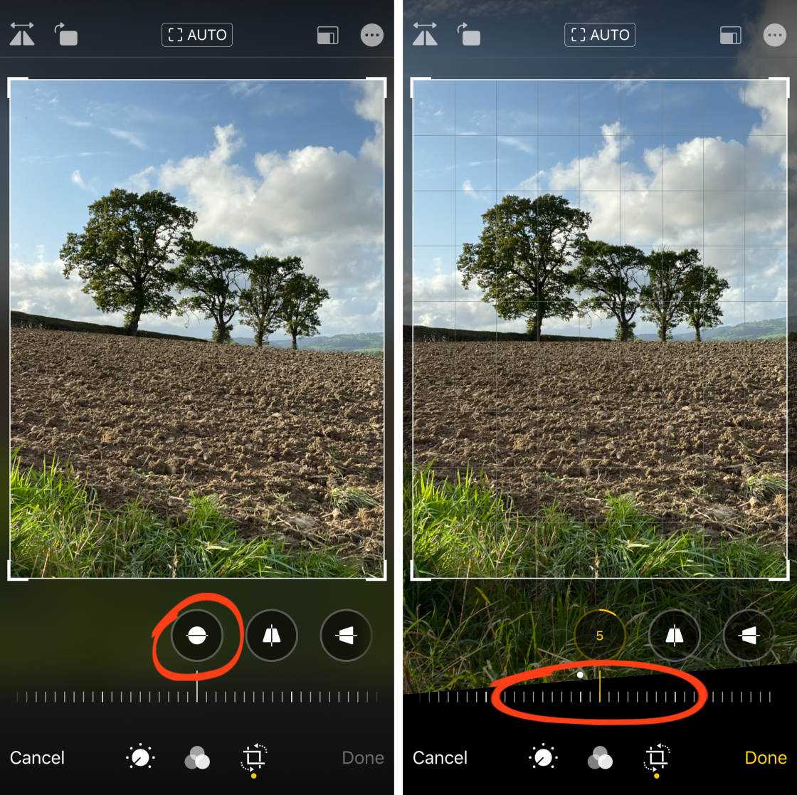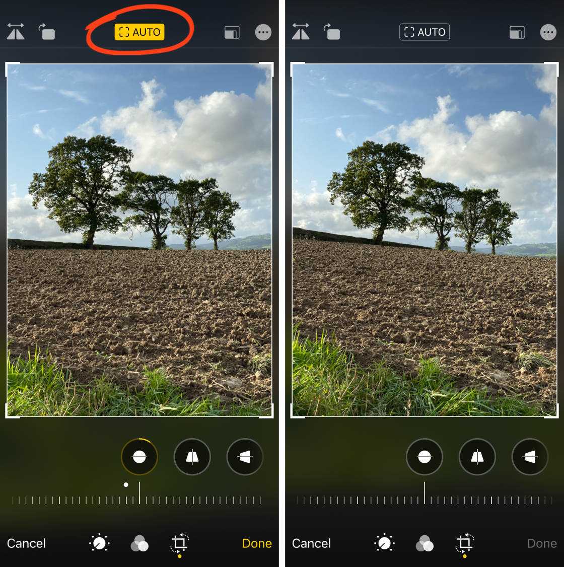 Если iPhone применил автоматическую обрезку или выпрямление, вы увидите AUTO желтого цвета в верхней части экрана. Если вы не хотите принимать эти автоматические настройки, нажмите желтый значок AUTO.