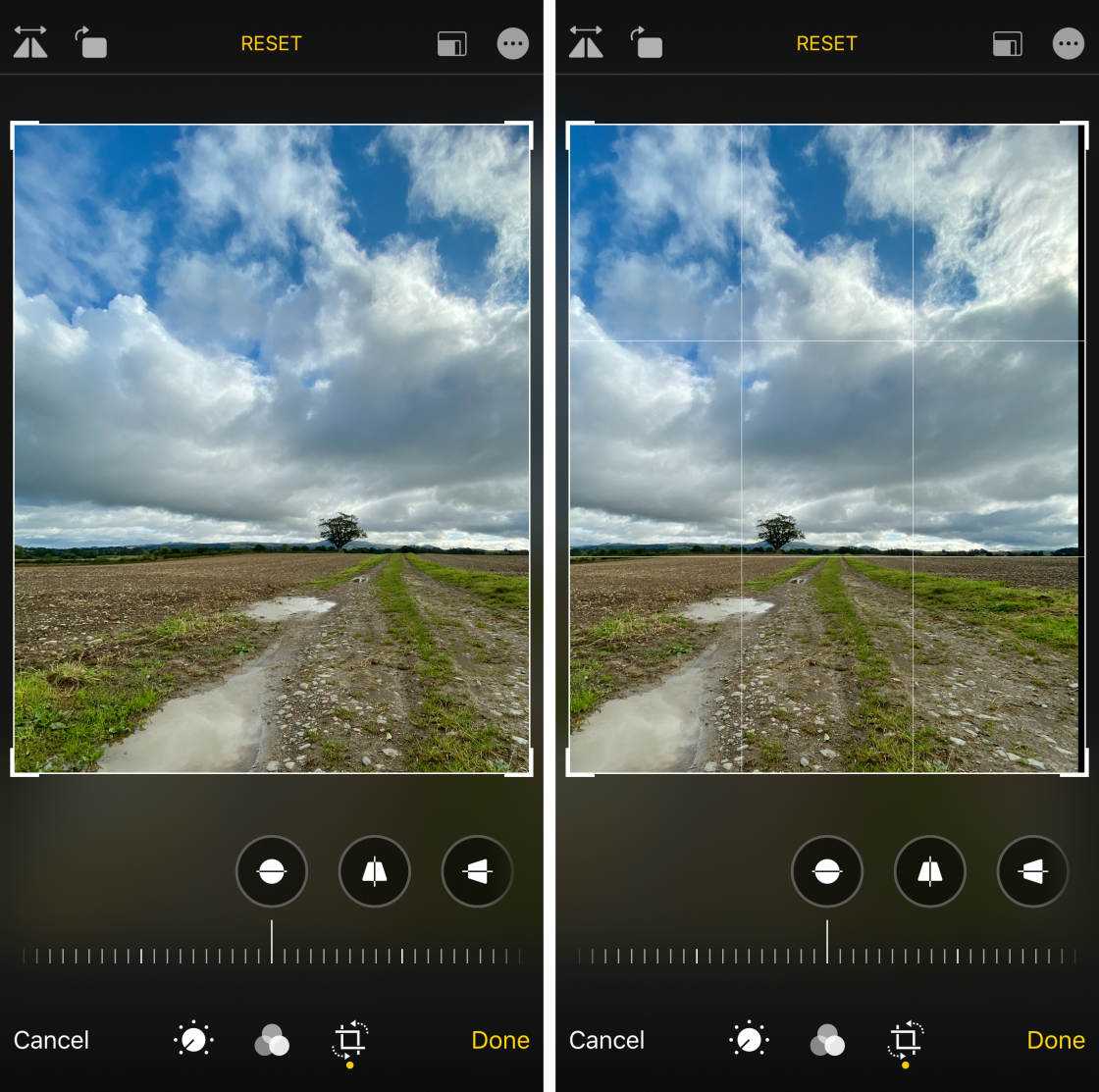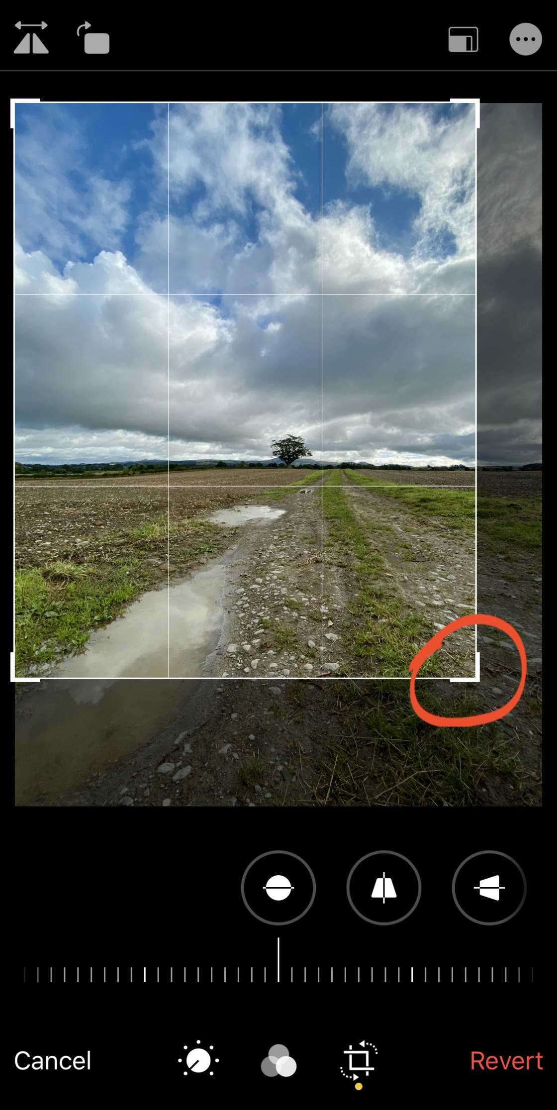 Нажмите инструмент Выпрямить под изображением. Затем перетащите ползунок, чтобы повернуть и выпрямить фотографию. Используйте линии сетки, чтобы помочь вам сделать фотографию идеально ровной.