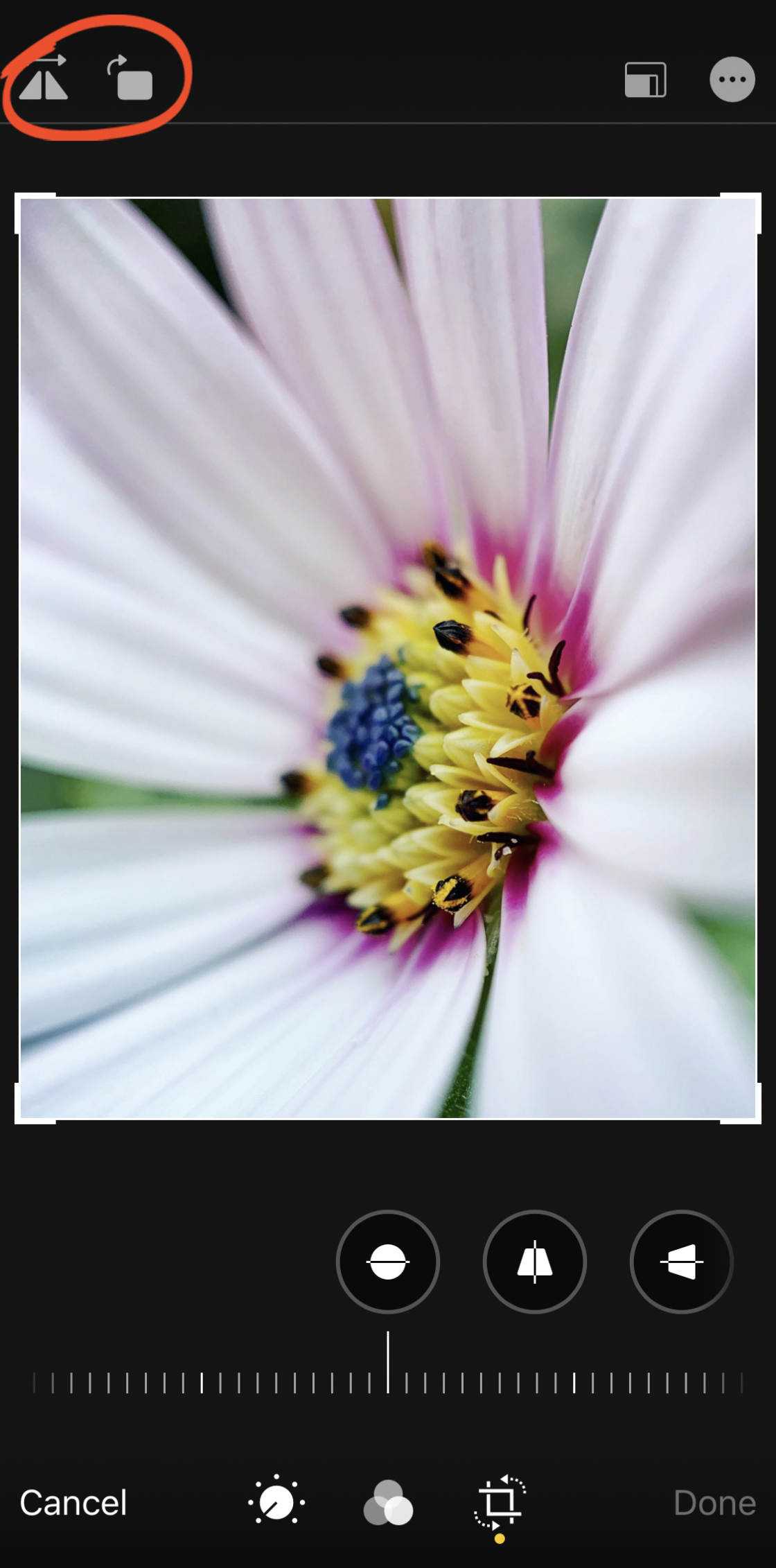 В верхней левой части экрана Crop находятся два значка: Flip и Rotate.