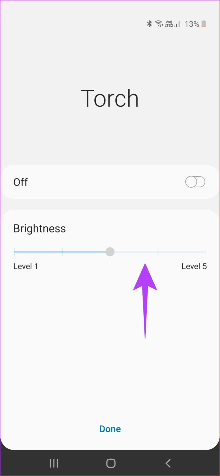 Шаг 3: Теперь вы найдете ползунок яркости фонарика. Samsung предлагает вам пять уровней для регулировки яркости фонарика. Итак, перетащите ползунок вправо, чтобы увеличить яркость.