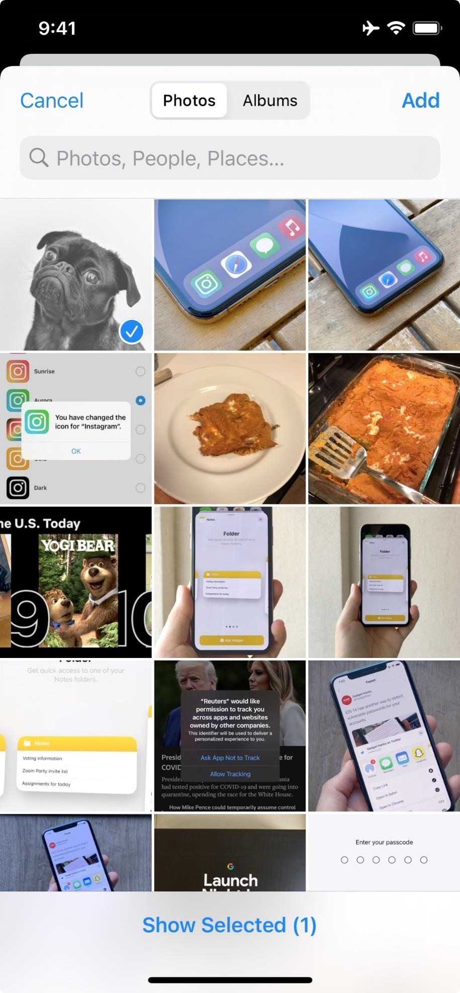 После установки выбранного приложения на iPhone откройте его. Здесь должна появиться кнопка “Добавить”. В Photo Widget она находится в правом верхнем углу. Нажмите ее, дайте приложению разрешение на просмотр галереи iPhone, если его попросят, и на экране появится селектор фотографий. Здесь можно просмотреть все фотографии в приложении “Фото”, включая все альбомы. Чтобы выбрать нужную фотографию, просто коснитесь ее. Хотя можно выбрать несколько изображений, виджет будет циклически перебирать варианты, а не показывать только одну из фотографий. Когда выбор будет сделан, просто нажмите кнопку “Добавить”.