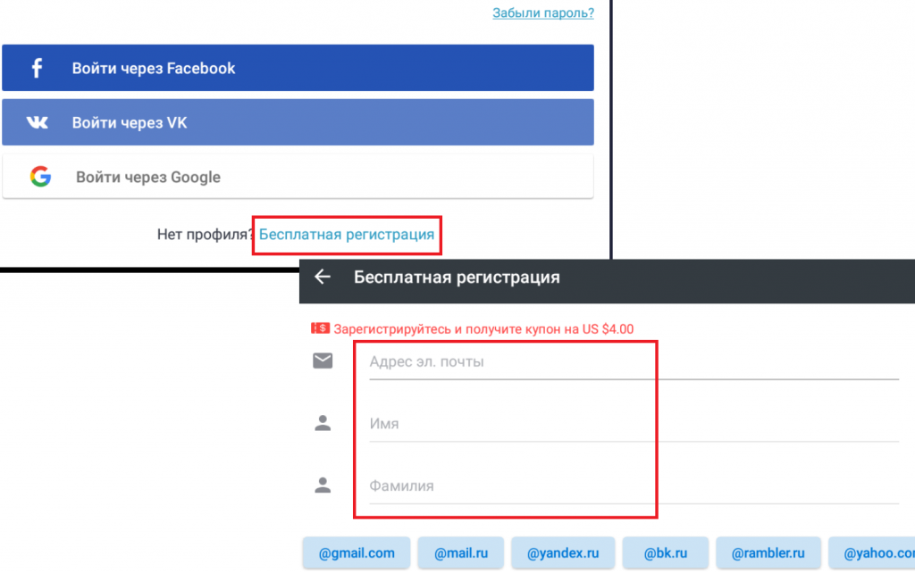 Если пользователь ещё не успел зарегистрироваться, для входа в личный кабинет приложения ему придётся пройти несложную регистрацию, практически не отличающуюся от аналогичных действий на сайте AliExpress. Для получения доступа к возможностям понадобится указать только личные данные и электронную почту. Новый клиент, как правило, получает скидочный купон на первую покупку в размере нескольких долларов.