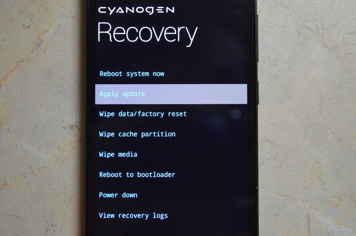 Выберите пункт Apply update, а затем Choose from internal storage (если архив с прошивкой сохранен во внутренней памяти) или Choose from sdcard (если архив сохранен на карте памяти).