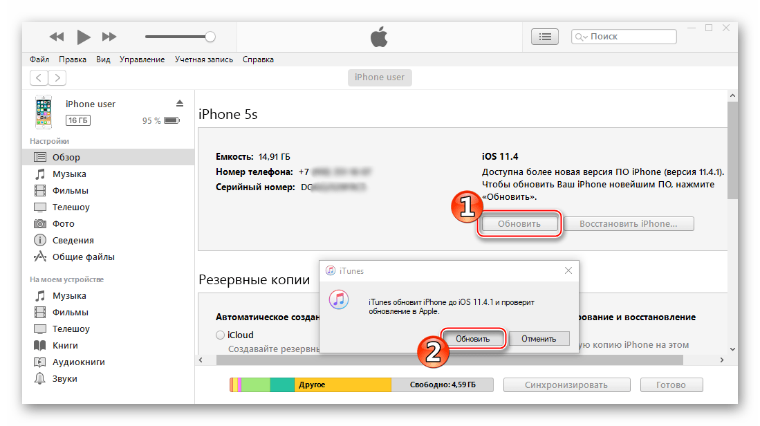Для инициации процесса обновления iOS до последней версии дважды нажмите кнопку «Обновить» — на вкладке «Обзор» и затем в окошке-запросе о готовности к запуску процедур.
