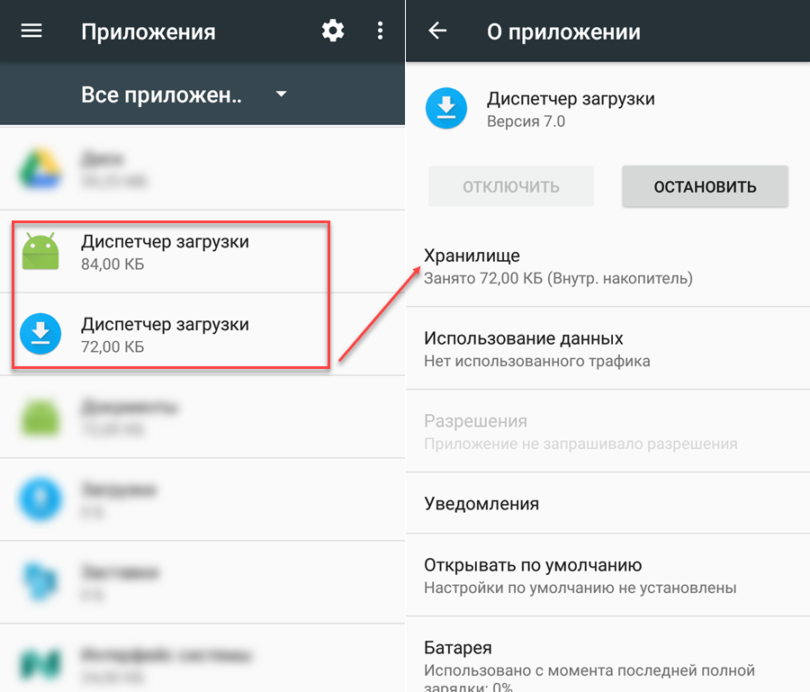 При использовании преимущественно устаревших устройств на платформе Android первый способ окажется бесполезным, так как помимо шкалы загрузки «Панель уведомлений» не предоставляет дополнительных инструментов. В таком случае можно прибегнуть к системному приложению «Диспетчер загрузки», остановив его работу и, тем самым, удалив все активные скачивания. Дальнейшие названия пунктов могут незначительно различаться в зависимости от версии и оболочки Андроид.