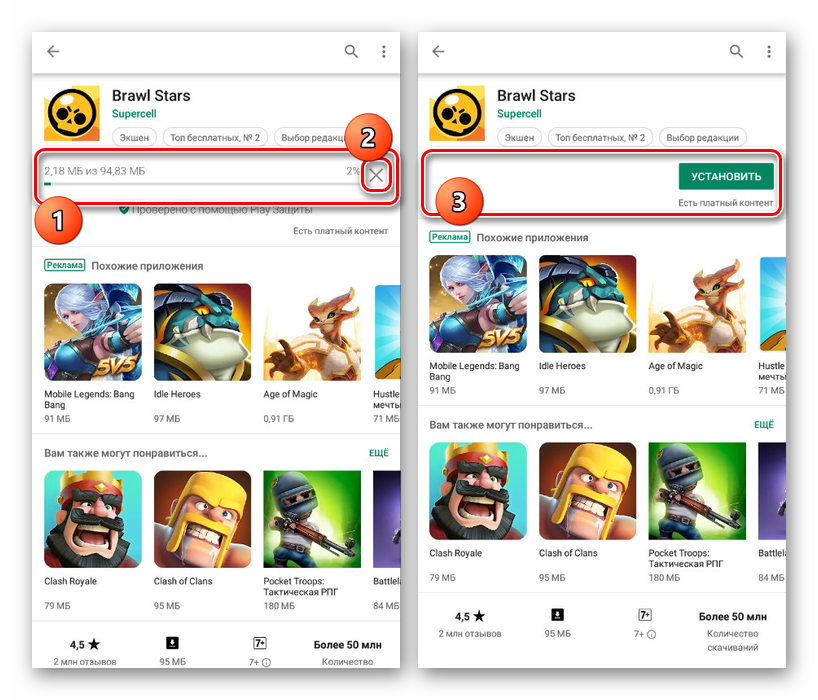 Открыв приложение в Плей Маркете, найдите полосу скачивания и нажмите по значку с изображением крестика. После этого процесс будет сразу же прерван, а добавленные на устройство файлы удалятся. На этом способ можно считать законченным.