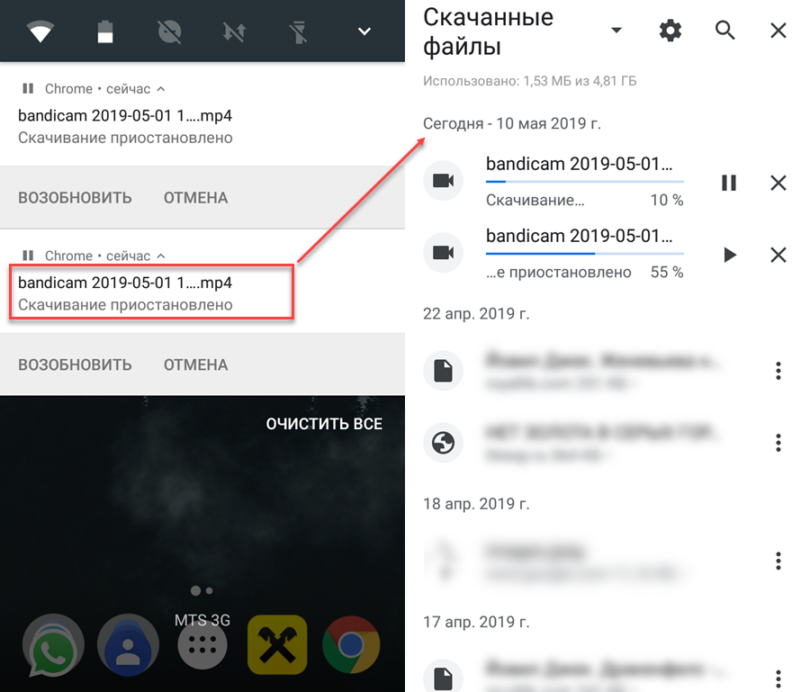 Шаг 2. Если вы скачиваете файл через браузер, то при вызове панели уведомлений появится кнопка «Пауза». Нажмите ее, чтобы временно приостановить загрузку. Используйте на кнопку «Возобновить», чтобы продолжить скачивать файл.