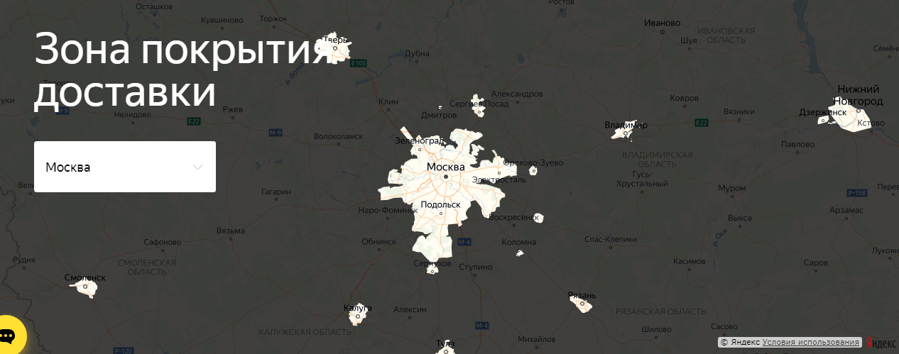 Города и зона покрытия Яндекс Еда доставка (Москва, Спб)