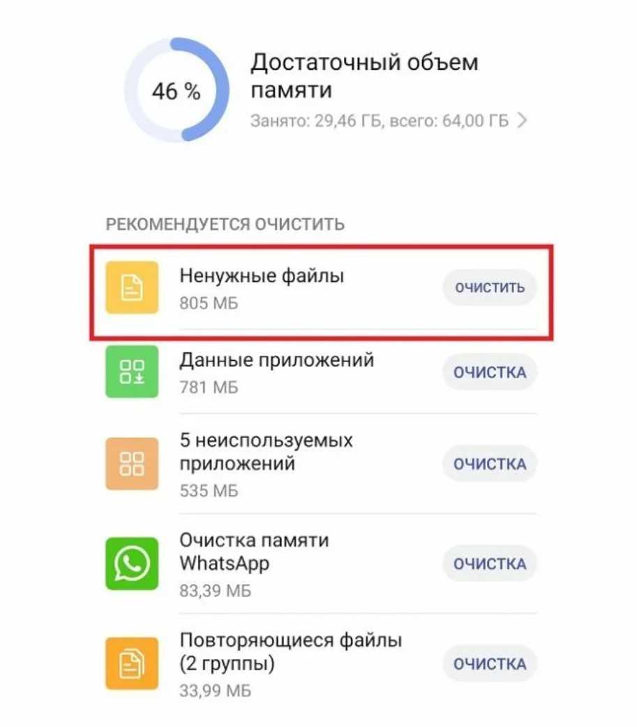 Ненужные файлы. Память Андроид устройств автоматически забивается кэшем, временными файликами, остатками рекламы и остальным мусором, поэтому на эту строчку можно нажимать без опасения – ничего важного не удалится.
