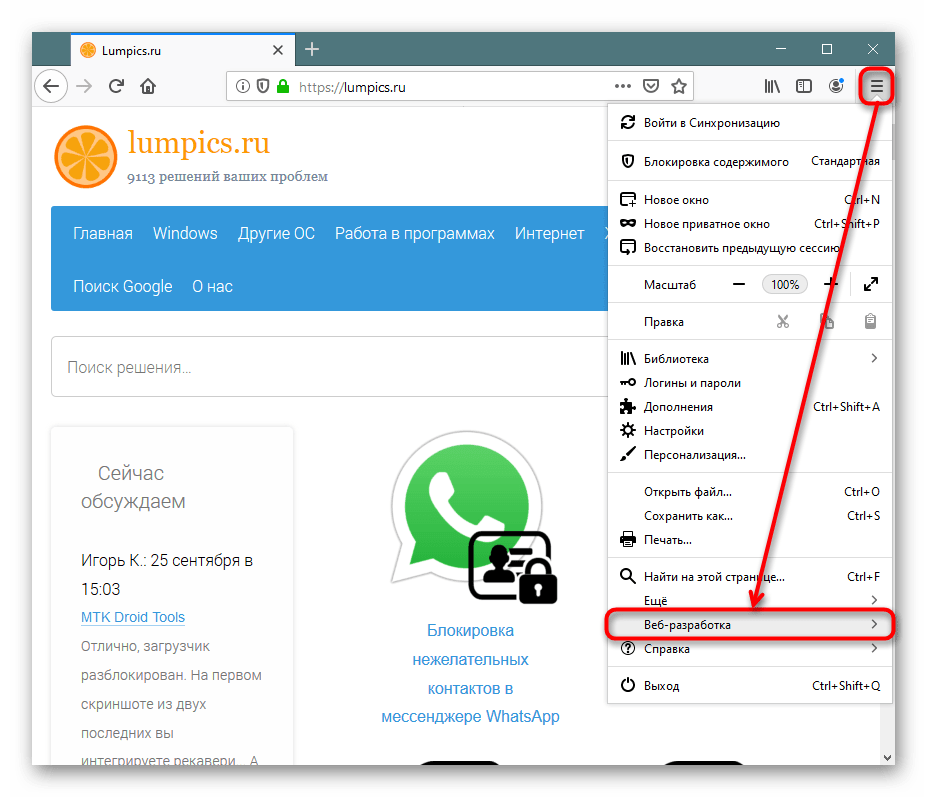- Наведите курсор мыши на «Разработчик» в меню и выберите «Инструменты разработчика».
