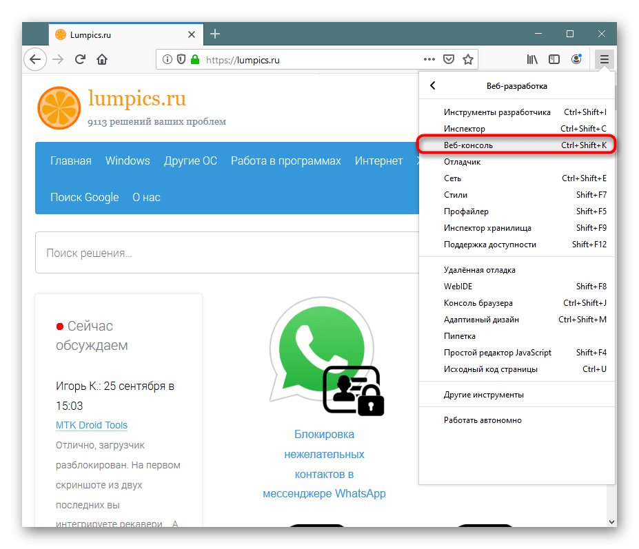 - Firefox. В настройках браузера, либо «Ctrl + Shift + J».