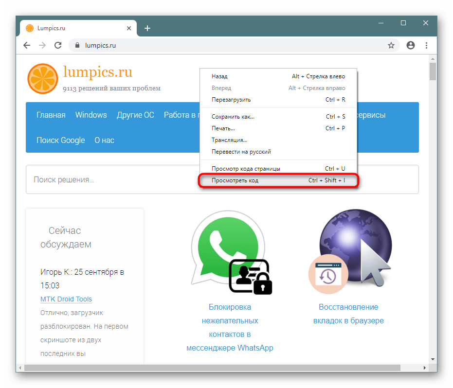 - Кликаем правой кнопкой и выбираем «Посмотреть код» — откроется вкладка Elements.
