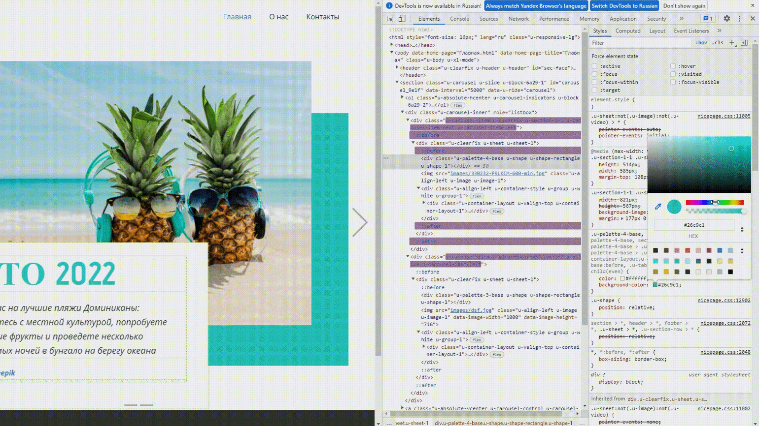 Например, мы решили поменять цветовую гамму нашего лендинга про Доминикану с холодной на тёплую — лето же всё-таки: