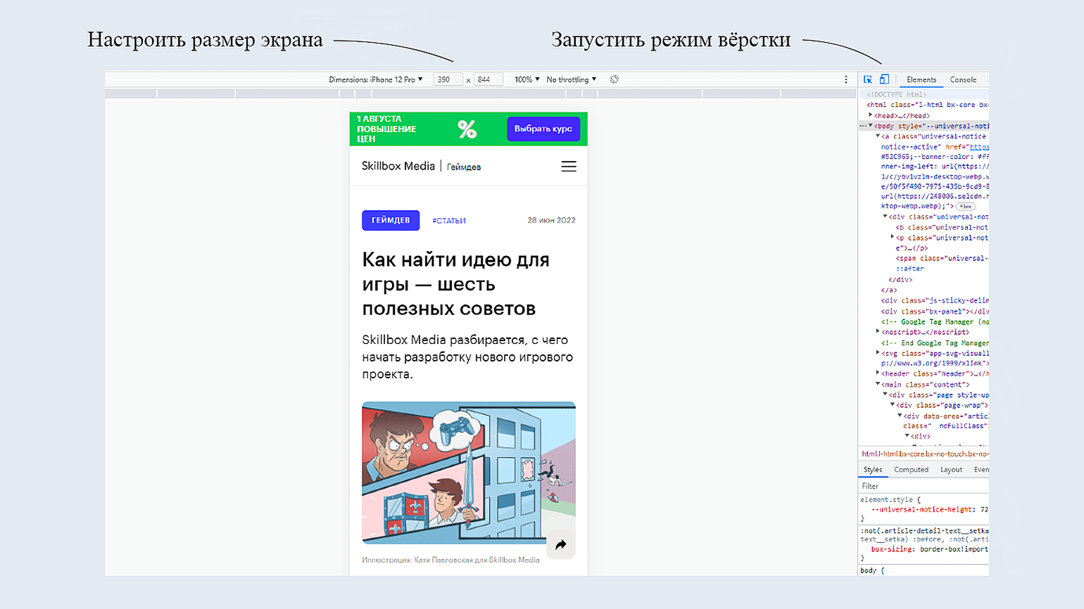 Важная часть работы фронтендера — сделать так, чтобы сайт было удобно читать на мобильных устройствах. Для этого в панели DevTools есть режим смартфона — он имитирует работу разных девайсов и помогает адаптировать контент под небольшие экраны.