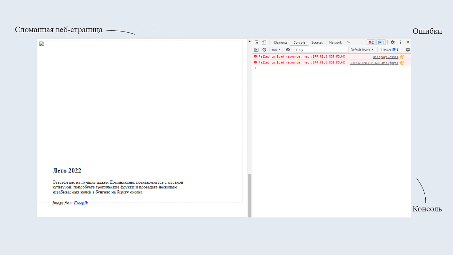 На нашем сайте Chrome обнаружил две проблемы: потерялись фотографии и CSS. Так бывает, когда какая-то строка в коде ссылается на несуществующий файл. Например, если мы вместо реально существующей картинки photo.png случайно вызываем foto.png.