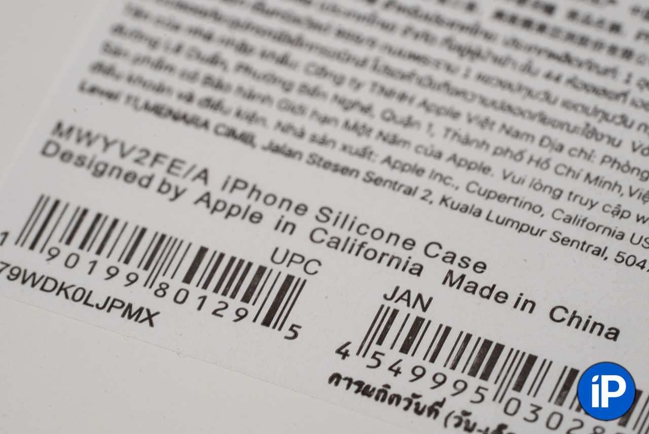 Так же, на оборотной стороне коробки оригинала, можно найти две наклейки: первая — с информацией, а вторая со штрих-кодом, который, если заморочиться, можно проверить, зайдя на сайт Apple и в коде страницы найти точную модель чехла, которая соответствует надписи на наклейке упаковки.