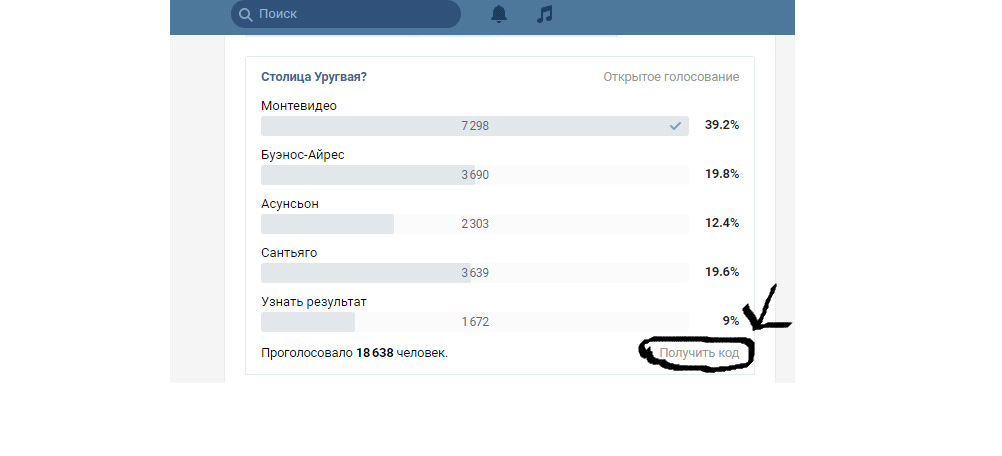 Заходим во вконтакте, находим нужный опрос. Внизу опроса, справа нажимаем «получить код».