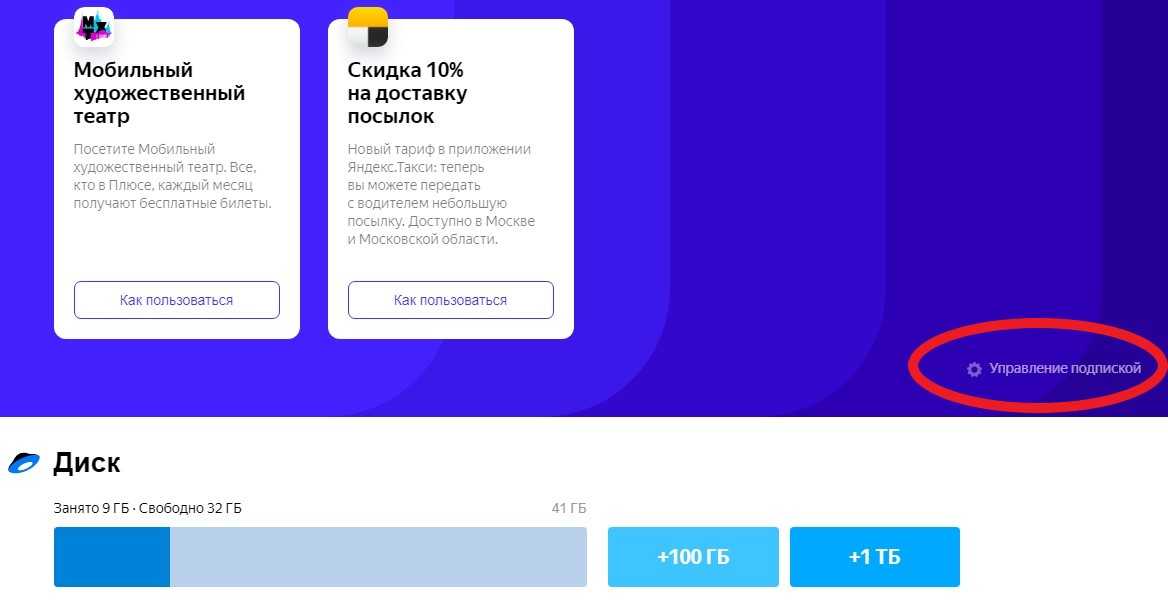 - Вы попали на страницу подписки Яндекс.Плюс. Пролистайте страницу вниз и в правом нижнем углу синего блока Вы можете увидеть ссылку «Управление подпиской». Перейдите по ней.