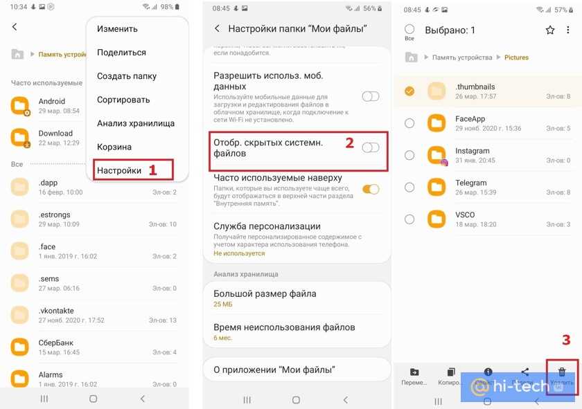 Следующий способ – удаление папки, которая содержится в корневом разделе DCIM (или Pictures) системы Android и содержит в себе все мини копии картинок и фотографий, которые встречаются вам при серфинге в интернете и в приложениях. Этот раздел также может занимать очень большой объем данных, если ранее вы еще не проводили подобную очистку.