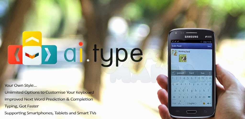 Ai.type – клавиатура с максимальным количеством возможностей. Помимо исправлений и подсказок, можно добавлять в текст смайлики и картинки. Упрощает работу наличие автоматических шаблонов, возможность создания раскладок и т.д.
