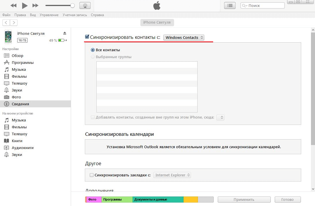 2Чтобы понять, как перенести контакты с iPhone на компьютер, выберете раздел «Сведения» слева. Поставьте галочку возле надписи «Синхронизировать…». Если пользуйтесь Outlook, правее выбирайте этот вариант. Иначе «Windows Contacts». В конце нажмите «Применить» в левом нижнем углу.