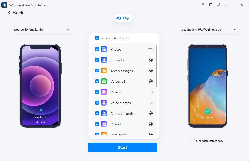 На интерфейсе вы можете увидеть тип данных, которые хотите переместить. Просто выберите типы данных отсюда и нажмите на кнопку “Пуск”, чтобы перенести выбранные данные с Huawei на Samsung. Если вы хотите, вы можете включить опцию “Очистить данные перед копированием”, чтобы стереть существующие данные на целевом телефоне.